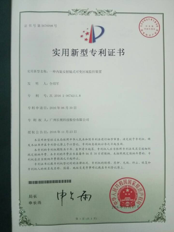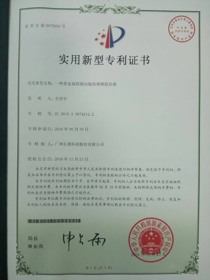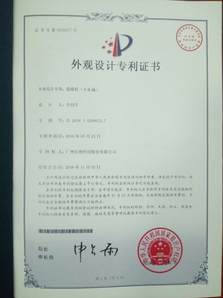 2016年12月20日,長(zhǎng)視科技榮獲兩個(gè)實(shí)用新型專利證書和一個(gè)外觀設(shè)計(jì)專利證書。